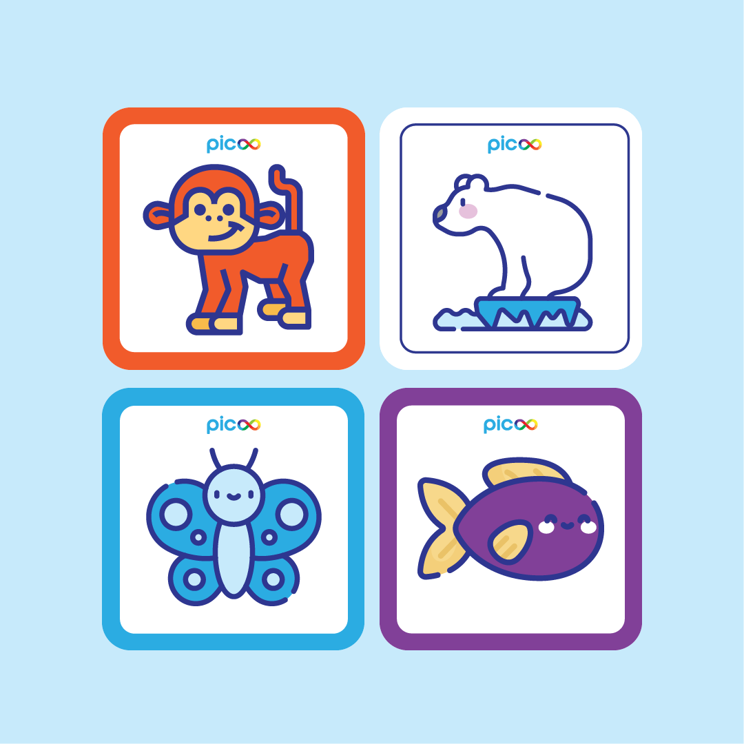 Deze quiz is een visuele aanvulling op het spel Dierenrijk. De kaartjes bevatten herkenbare, kleurrijke afbeeldingen van de dieren die in het spel voorkomen — zoals de witte ijsbeer, blauwe vlinder, oranje aap en paarse vis. Let op: dit spel speel je zonder Smartsleeves. Deze visuals zijn puur bedoeld als ondersteuning voor jonge spelers die wat extra hulp kunnen gebruiken bij het herkennen van de juiste dieren.
